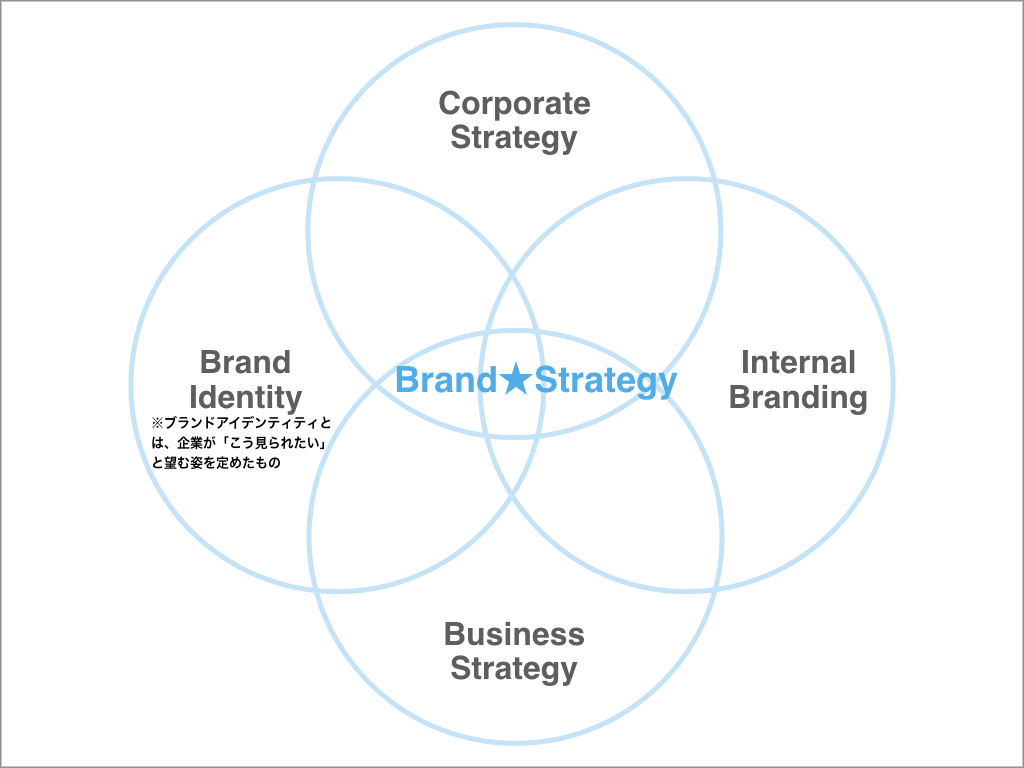 多くの企業がブランド戦略の必要性を理解していません。そもそもブランド戦略の位置付けを誤解している企業が多いように思います。ブランド戦略とは、下記の図が示すように、企業戦略と事業戦略、インターナルブランディング(従業員のエンゲージメント向上施策)とブランドアイデンティティ(企業が『こう見られたい』と望む姿を定めたもの)の全ての「中核」に位置づけられる、経営の最重要パートです。ブランド戦略は企業活動において、「あっても無くても良いけど、あったら尚良い」という「方程式の一部」ではなく、企業活動において必須の「方程式全体」なのです。言い換えると、ブランド戦略は「四方の戦略を束ねる結節点」とも言えます。